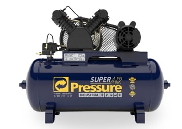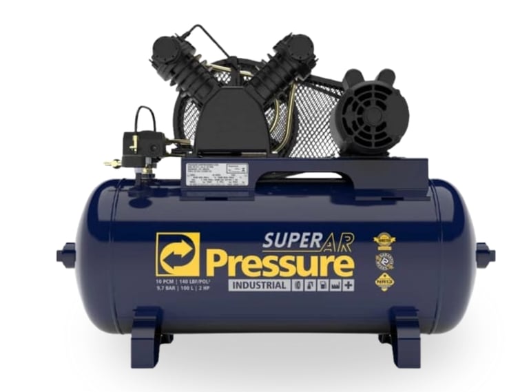 O Compressor Pressure Super Ar 10 pés é modelo de alto desempenho com reservatório de 100 litros, motor de 2 HP, monofásico, suporta pressão máxima de 140 PSI — ideal para oficinas, pintura, manutenção e uso profissional leve.