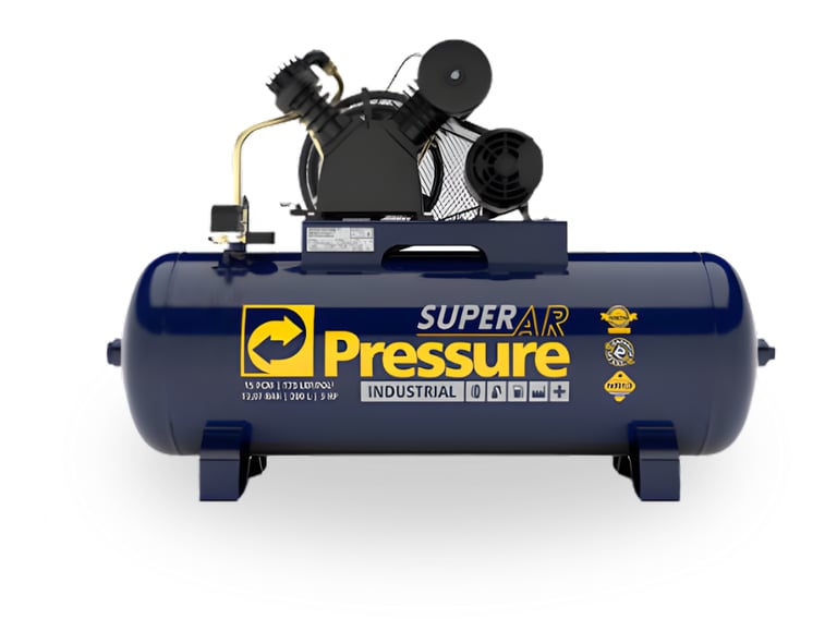O Compressor Pressure Super Ar 15 pés é modelo industrial de alta pressão com reservatório de 200 litros, motor trifásico de 3 HP e pressão máxima de 175 PSI — ideal para operações exigentes em oficinas e indústrias leves.