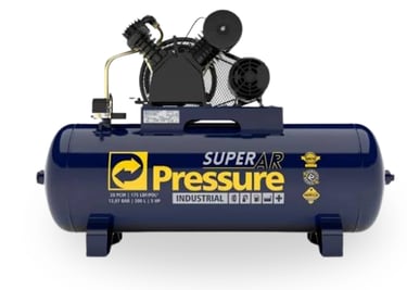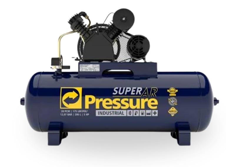 O Compressor Pressure Super Ar 20 pés oferece alto desempenho com 200 litros, motor trifásico de 5 HP e pressão máxima de 175 PSI, ideal para uso industrial e produção contínua.