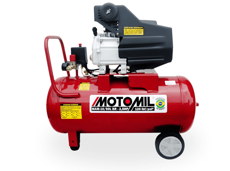 O Motomil MAM-10/50L é motocompressor com reservatório de 50 litros, indicado para uso hobby ou doméstico, para tarefas como pintura leve, limpeza de ferramentas, suporte moderado de ar comprimido. Leroy Merlin+1